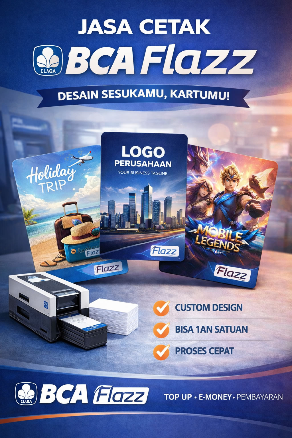 Tampil Beda & Eksklusif dengan Desain Kartu Sesuai Gaya Anda. Kini, kartu BCA Flazz tidak hanya berfungsi sebagai alat pembayaran digital, tapi juga bisa menjadi bagian dari identitas dan gaya Anda! Dengan layanan Print UV Custom Design, Anda bisa mencetak desain pribadi, logo perusahaan, nama, atau ilustrasi unik langsung di permukaan kartu Flazz.